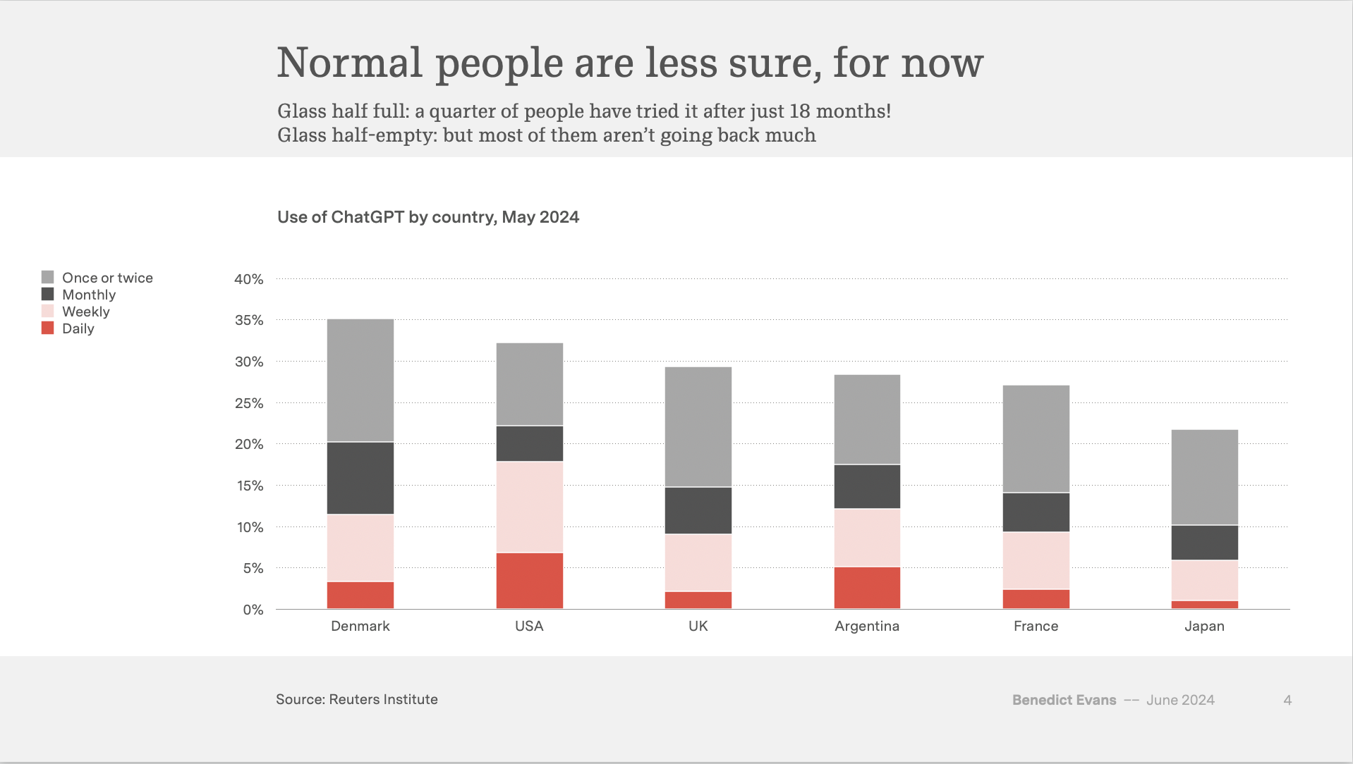 Finally, all of these are still just theses. None of this worked just 18 months ago, and we don’t have product-market fit yet. Anything up to half of the population of many developed world countries has already tried generative AI, but half of those never tried it twice. That’s great awareness for something so new, but it’s not traction. We don’t know what the product will be, nor the market, nor the science, and everything is still changing really fast. There may be new breakthroughs in agents or error rates that change the use cases entirely.