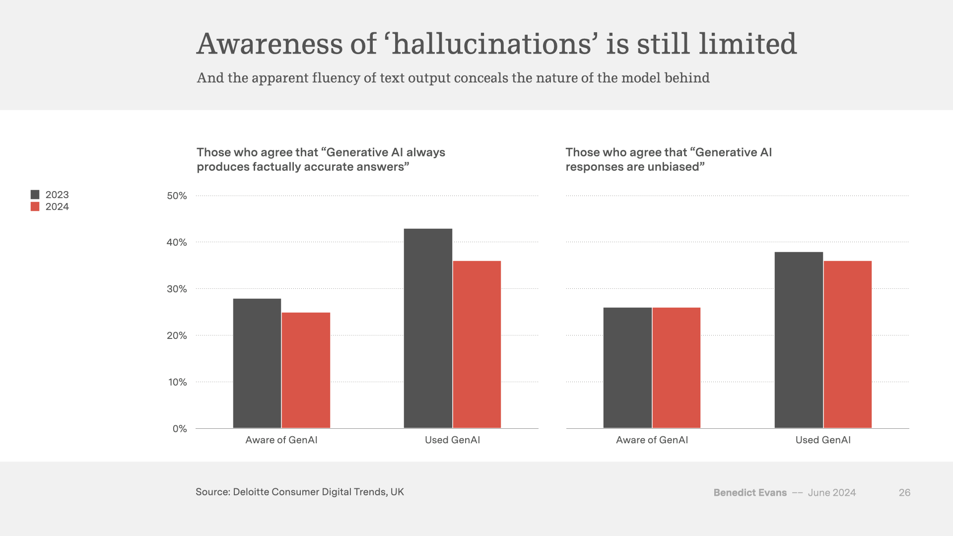 On one hand, the product design in the screenshot is communicating certainty when the model itself is inherently uncertain. Google gives you (mostly) ten blue links, which communicates ‘it’s probably one of these’, but here we are given one ‘right’ answer. This misleads a lot of people, especially since the text generation (as distinct from the actual answer) is pretty much perfect. Indeed, this fascinating survey from Deloitte suggests that people are more likely to be misled by this apparent certainty once they’ve used these systems.