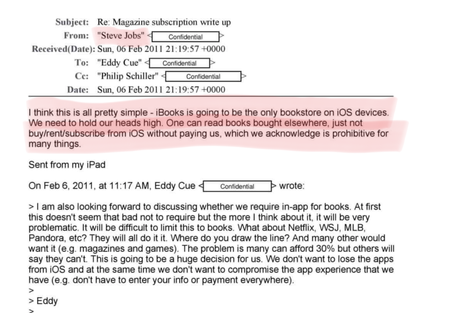In case there was any doubt, Steve Jobs was very clear about this internally in 2011, in the email below: the new rules introduced in 2011 would preclude some competitors. These rules would be good for users in some ways (see Eddy Cue’s comment further down about the app experience) but bad in others.
