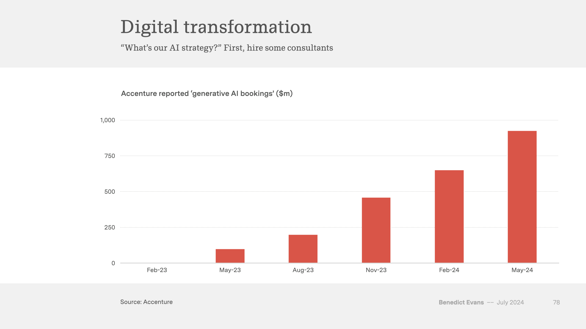 Accenture, meanwhile, gave us a great illustration of the scale of that enterprise experimentation, but also how much it’s only experimentation for now - again, a glass half-full / half-empty illustration. Last summer it proudly announced that it had already done $300m of ‘generative AI’ work for clients… and that it had done 300 projects. Even an LLM can divide 300 by 300 - that’s a lot of pilots, not deployment. The number has gone up a lot since then, but what’s the mix? Indeed, with BCG saying that it expects 20% of its revenue this year will be helping big companies work out what to do about generative AI, the single biggest business from this in 2024 might be for consultants explaining what it is. (It’s the only thing that anyone wants to talk to me about.)