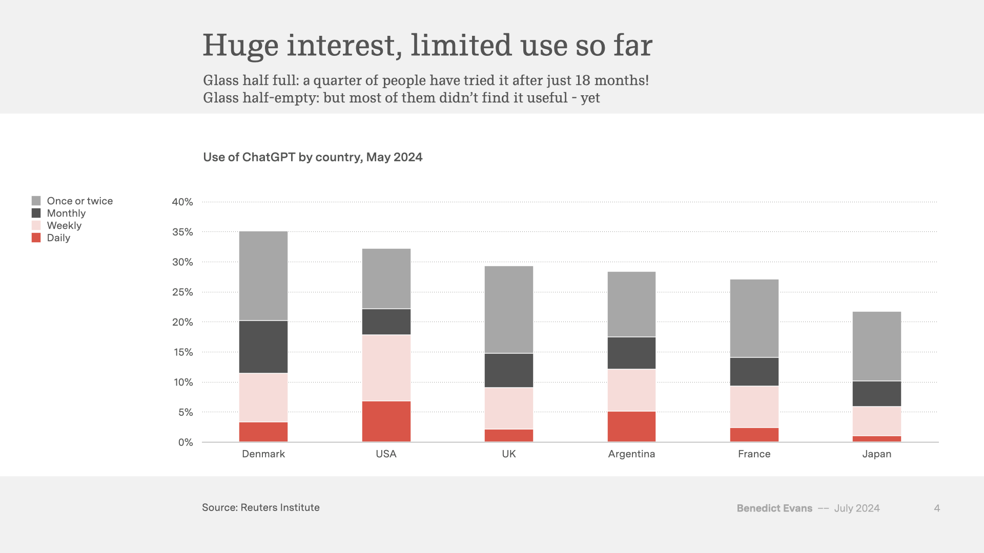 There are a couple of ways that you could answer this. It does take time to change your habits and ways of thinking around an entirely new kind of tool (remember when we printed out emails?). We can be certain that the models will get better at least to some extent - agents, voice and multimodal will expand the problems they can solve. But I’ve also argued (here last October, for example) that an LLM by itself is not a product - it’s a technology that can enable a tool or a feature, and it needs to be unbundled or rebundled into new framings, UX and tools to be become useful. That takes even more time.