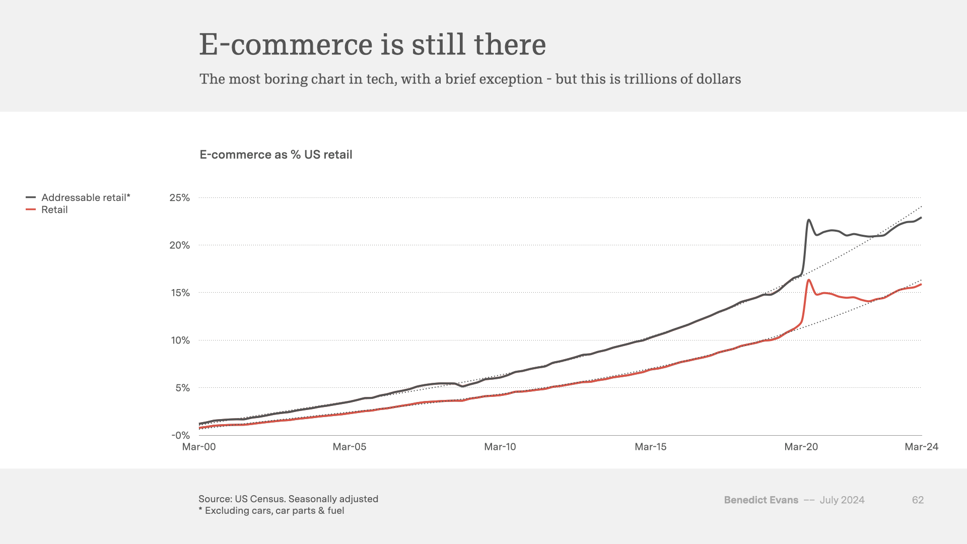 My old boss Marc Andreessen liked to say that every failed idea from the Dotcom bubble would work now. It just took time - it took years to build out broadband, consumers had to buy PCs, retailers and big companies needed to build e-commerce infrastructure, a whole online ad business had to evolve and grow, and more fundamentally, consumers and businesses had to change their behaviour. The future can take a while - it took more than 20 years for 20% of US retail to move online.