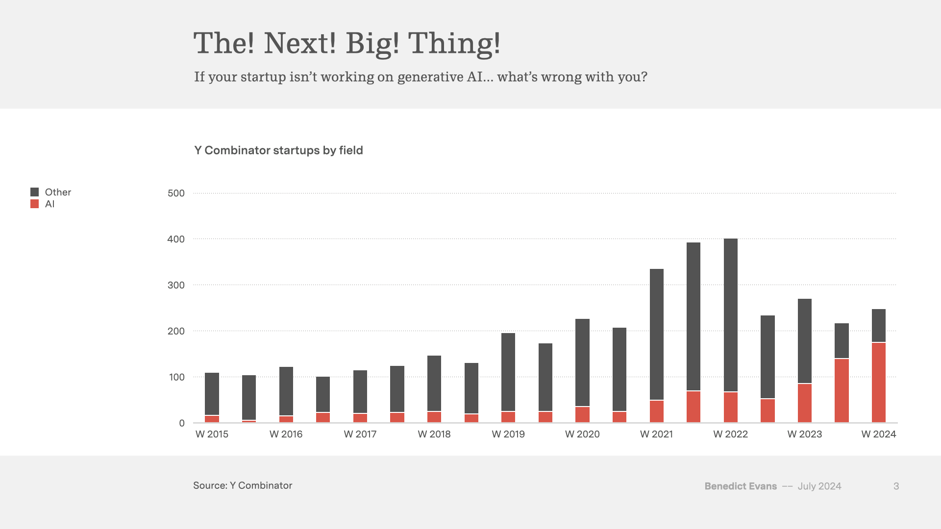 But you could also suggest that these startups are a collective Silicon Valley bet that LLMs are a technology, not a product, and that we need to go though the conventional process of customer discovery towards product-market fit. The thing that really drives a bubble in generative AI, at least arguably, is the idea that history is over and LLMs will be able to do everything, and in that case we wouldn’t need any of these companies. On that view, these companies are the anti-bubble (a neatly Panglossian idea).