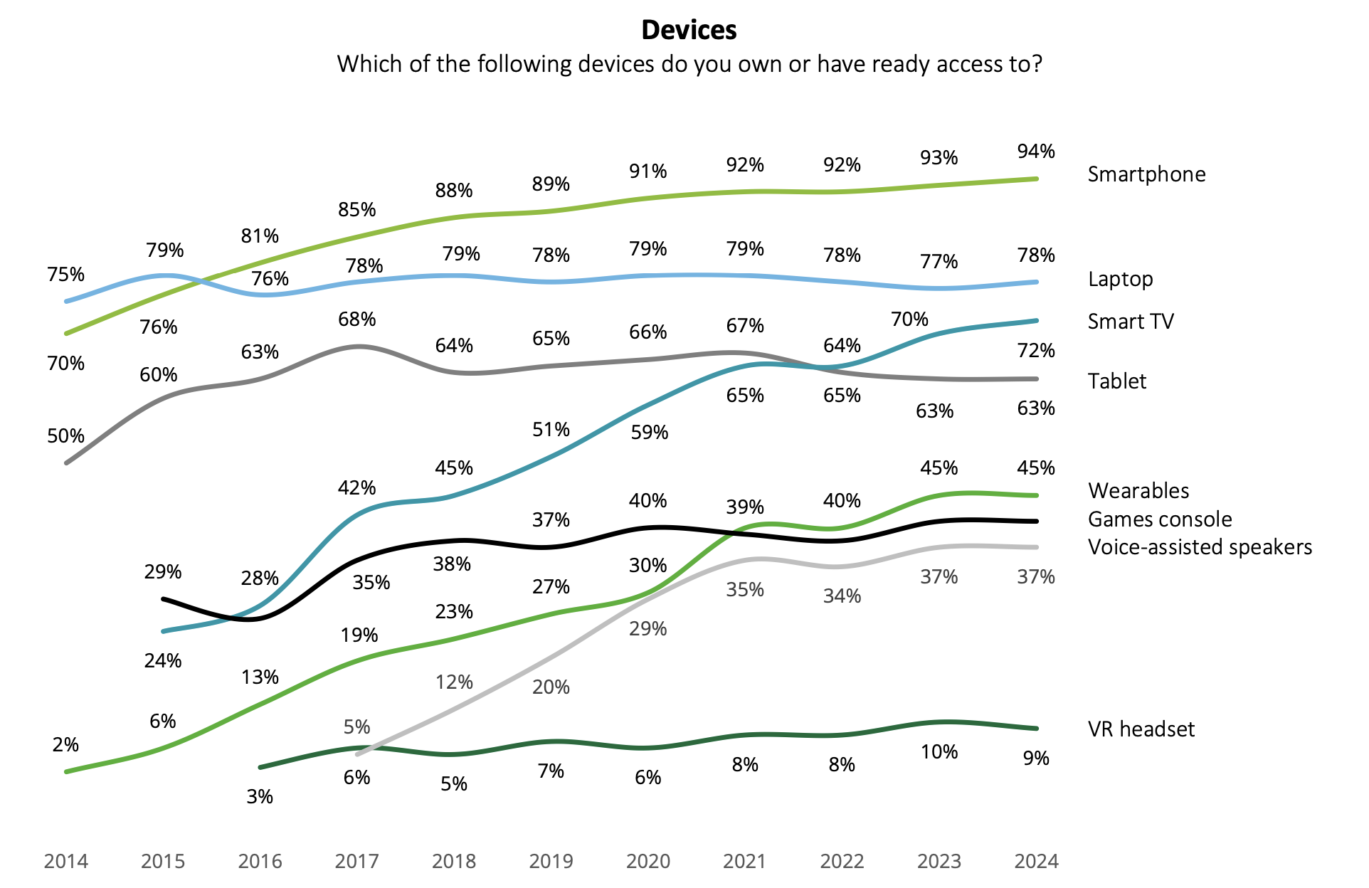 Some VR apps do well, but the platform at a whole is small, and not really growing either. Meta probably sold 1m of the Quest 3 (seen in the spike in Q4 2023, but compare with this data from Deloitte for the UK - the installed base is basically flat and only 20% of people who own one use it every day. That’s a 2% DAU penetration.
