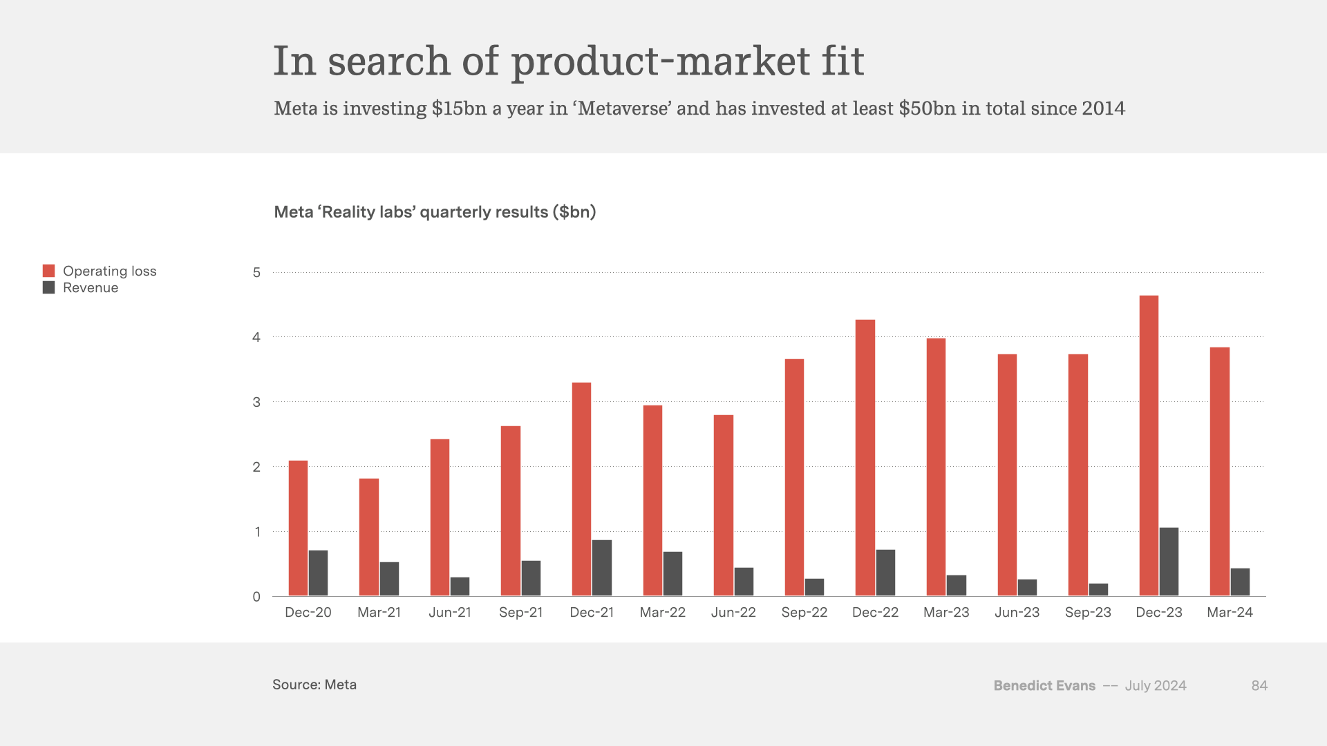 There’s nothing new to say about this: Meta has a device at roughly the right price that isn’t good enough yet, and Apple has a device with a much better spec, at least on some measures, that isn’t cheap enough or light enough yet (I wrote about that here). And meanwhile, we don’t have product-market fit.